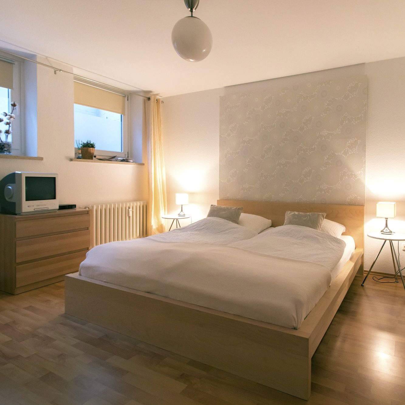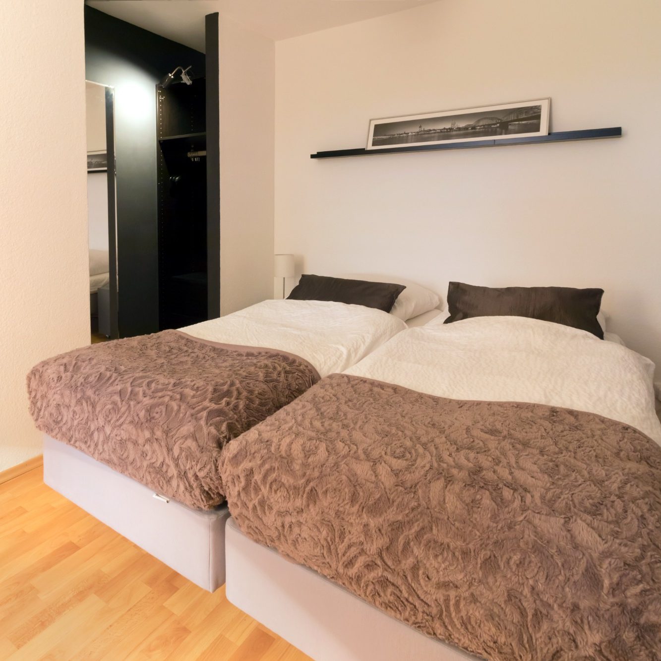 In einem Schlafzimmer steht ein Boxspringbett (180×200 cm) mit 2 Matratzen. Das zweite Schlafzimmer verfügt über zwei Einzelbetten (jeweils 80×200 cm).