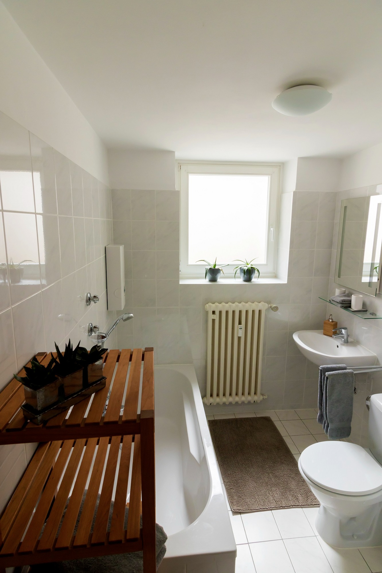 Beide Badezimmer sind modern und großzügig ausgestattet mit Badewanne bzw. Dusche, Toilette und Waschbecken.